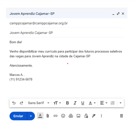 Envie seu currículo por email: camppcajamar@camppcajamar.org.br, veja o exemplo abaixo de como fazer.